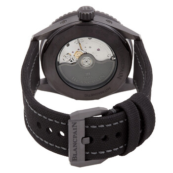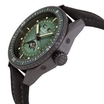 Ceramic case with a sail-canvas fabric strap. Uni-directional rotating black ceramic bezel. Sunburst green dial with index hour markers. Date scale around an inner ring. Minute markers around the outer rim. Dial Type: Analog. Luminescent hands and markers. Complete calendar. One subdial displaying: moonphase. Blancpain Calibre 6654.P.4 automatic movement with a 72-hour power reserve. Scratch resistant sapphire crystal. Screw down crown. Transparent see through case back. Round case shape, case size: 43.6 mm, case thickness: 14.1 mm. Buckle clasp. Water resistant at 30 meters / 100 feet. Functions: full calendar, moon phase, date, day, hour, minute, second. Fifty Fathoms Series. Dive watch style. Watch label: Swiss Made. Item Variations: N05054O001053NB52A. Blancpain Fifty Fathoms Bathyscaphe Quantième Complet Automatic Men's Watch 5054-0153-B52A.