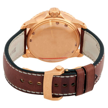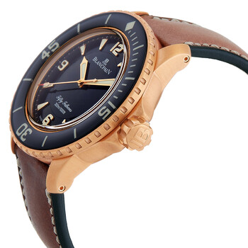 18kt rose gold case with a brown leather strap. Uni-directional rotating coin edge 18kt rose gold bezel with a black sapphire count-up elapsed time top ring. Black dial with luminous hands and index and Arabic hour markers. Minute markers around the outer rim. Dial Type: Analog. Luminescent hands and markers. Date display between 4 and 5 o'clock position. Blancpain Calibre 1315 Automatic movement, containing 35 Jewels, composed of 227 parts, and has a power reserve of approximately 120 hours. Scratch resistant sapphire crystal. Screw down crown. Round case shape, case size: 45 mm, case thickness: 15.4 mm. Fold over clasp. Water resistant at 300 meters / 1000 feet. Functions: date, hour, minute, second. Fifty Fathoms Series. Dive watch style. Watch label: Swiss Made. Item Variations: 5015A 3630 63B, 5015A.3630.63B, 5015A363063B. Blancpain Fifty Fathoms Black Dial Brown Leather Automatic Men's Watch 5015A-3630-63B.