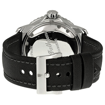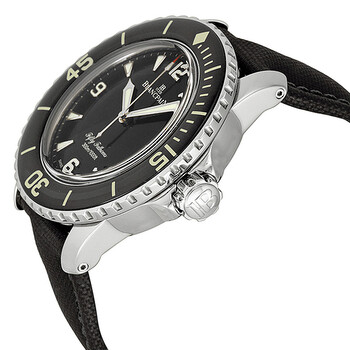Stainless steel case with a fabric sailcloth strap. Uni-directional rotating black bezel. Black dial with luminous hands and dot hour markers. Arabic numerals mark the 3, 6, 9 and 12 o'clock positions. Minute markers around the outer rim. "No Radiations" logo apperas center dial. Dial Type: Analog. Luminescent hands and markers. Date display at the 3 o'clock position. Automatic movement with 120 hours power reserve. Scratch resistant sapphire crystal. Screw down crown. Solid case back. Case diameter: 45 mm. Round case shape. Tang clasp. Water resistant at 300 meters / 1000 feet. Functions: hour, minute, second. Additional Info: "Tribute to Fifty Fathoms" limited edition of 500 pieces. Luxury watch style. Watch label: Swiss Made. Blancpain Fifty Fathoms Black Dial Stainless Steel Automatic Men's Watch 5015-1130-52.