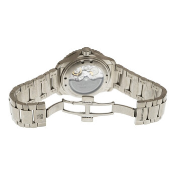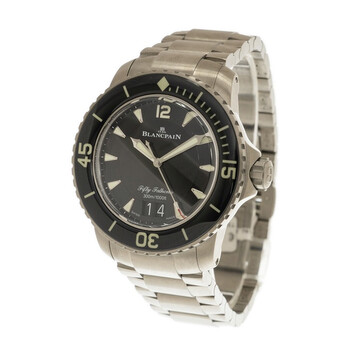 Grey titanium case with a grey titanium bracelet. Uni-directional rotating grey titanium bezel with an inlaid black ring. Black dial with luminous silver-tone hands and index hour markers. Arabic numeral appears at the 12 o'clock position. Minute markers around the outer rim. Dial Type: Analog. Luminescent hands and markers. Date display at the 6 o'clock position. Blancpain calibre 6918B automatic movement, containing 44 Jewels, bitting at 28800 vph, and has a power reserve of approximately 120 hours. Scratch resistant sapphire crystal. Screw down crown. Round case shape. Case size: 45 mm. Case thickness: 16.2 mm. Tang clasp. Water resistant at 300 meters / 1000 feet. Functions: big date, hour, minute, second. Additional Info: original box, international warranty card, manual (complete accessories). Fifty Fathoms Series. Dive watch style. Watch label: Swiss Made. Blancpain Fifty Fathoms Black Dial Unisex Watch 505012b3098.