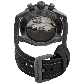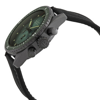 Black ceramic case with a black canvas strap. Uni-directional rotating green ceramic bezel. Green dial with index hour markers. Dial Type: Analog. Date display between 4 and 5 o'clock position. Chronograph - three sub-dials displaying: 60 second, 30 minute, and 12 hour. Blancpain Calibre F385 Automatic movement, containing 37 Jewels, composed of 322 parts, bitting at 36000 vph, and has a power reserve of approximately 50 hours. Scratch resistant sapphire crystal. Screw down crown. Transparent see through case back. Round case shape, case size: 43.6 mm, case thickness: 15.25 mm. Tang clasp. Water resistant at 300 meters / 1000 feet. Functions: chronograph, column wheel, flyback, date, hour, minute, small second. Additional Info: original box, manual (complete accessories). Fifty Fathoms Series. Luxury watch style. Watch label: Swiss Made. Blancpain Fifty Fathoms Chronograph Automatic Green Dial Men's Watch 5200 0153 B52A.