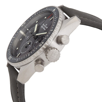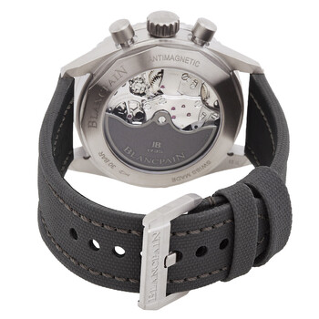 Grey titanium case with a grey nylon strap. Uni-directional rotating grey titanium bezel. Grey dial with silver-tone hands and index hour markers. Minute markers around the outer rim. Dial Type: Analog. Luminescent hands and markers. Date display between 4 and 5 o'clock position. Chronograph - three sub-dials displaying: 60 second, 30 minute, and 12 hour. Blancpain Calibre F385 Automatic movement, containing 37 Jewels, composed of 322 parts, bitting at 36000 vph, and has a power reserve of approximately 50 hours. Scratch resistant sapphire crystal. Screw down crown. Round case shape, case size: 43 mm. Buckle clasp. Water resistant at 300 meters / 1000 feet. Functions: chronograph, column wheel, flyback, date, hour, minute, small second. Additional Info: original box, international warranty card, manual (complete accessories). Fifty Fathoms Series. Dive watch style. Watch label: Swiss Made. Blancpain Fifty Fathoms Chronograph Automatic Grey Dial Men's Watch 5200-1210G-52A.
