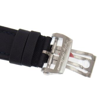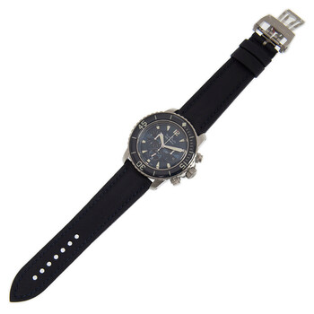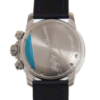 Silver-tone stainless steel case with a blue navy canvas strap. Uni-directional rotating blue bezel. Blue flinque dial with silver-tone hands and index- Arabic at the 12 o' clock hour markers. Minute markers around the outer rim. Dial Type: Analog. Luminescent hands and markers. Date display at the 6 o'clock position. Chronograph - three sub-dials displaying: 60 seconds, 30 minutes, and 12 hours. Blancpain Calibre F185 Automatic movement, based upon Frederic Piguet 1185, containing 37 Jewels, composed of 308 parts, bitting at 21600 vph, and has a power reserve of approximately 40 hours. Scratch resistant sapphire crystal. Screw down crown. Solid case back. Round case shape, case size: 45 mm, case thickness: 15.5 mm. Band width: 23 mm. Water resistant at 30 meters / 100 feet. Functions: chronograph, column wheel, flyback, date, hour, minute, small second. Fifty Fathoms Series. Luxury watch style. Watch label: Swiss Made. Item Variations: 5085FB 1140 52B, 5085FB.1140.52B, 5085FB114052B. Blancpain Fifty Fathoms Chronograph Automatic Men's Watch 5085FB-1140-52B.