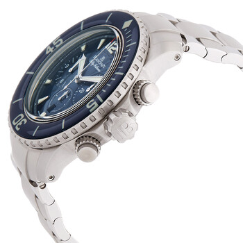 Silver-tone stainless steel case with a silver-tone stainless steel bracelet. Uni-directional rotating blue stainless steel bezel. Blue flinque dial with silver-tone hands and index- Arabic at the 12 o' clock hour markers. Minute markers around the outer rim. Dial Type: Analog. Luminescent hands and markers. Date display at the 6 o'clock position. Chronograph - three sub-dials displaying: 60 seconds, 30 minutes, and 12 hours. Blancpain Calibre F185 Automatic movement, based upon Frederic Piguet 1185, containing 37 Jewels, composed of 308 parts, bitting at 21600 vph, and has a power reserve of approximately 40 hours. Scratch resistant sapphire crystal. Screw down crown. Solid case back. Round case shape, case size: 45 mm, case thickness: 15.5 mm. Band width: 23 mm. Water resistant at 30 meters / 100 feet. Functions: chronograph, column wheel, flyback, date, hour, minute, small second. Fifty Fathoms Series. Luxury watch style. Watch label: Swiss Made. Blancpain Fifty Fathoms Chronograph Automatic Men's Watch 5085FB-1140-71B.