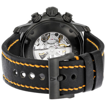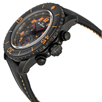 Black PVD stainless steel case with a black leather strap with contrast orange stitching strap. Bi-directional coin edge black PVD bezel. Black carbon fiber dial with luminous red hands and orange Arabic numeral hour markers. Minute markers. tachymeter scale appears around the outer rim. Dial Type: Analog. Luminescent hands and markers. Date display at the 6 o'clock position. Chronograph - three sub-dials displaying: 60 second, 30 minute and 12 hour. Blancpain Calibre F185 Automatic movement, based upon Frederic Piguet 1185, containing 37 Jewels, composed of 308 parts, bitting at 21600 vph, and has a power reserve of approximately 40 hours. Scratch resistant sapphire crystal. Screw down crown. Skeleton case back. Round case shape, case size: 45 mm, case thickness: 16 mm. Tang clasp. Water resistant at 300 meters / 1000 feet. Functions: chronograph, column wheel, flyback, date, hour, minute, small second. Fifty Fathoms Flyback Series. Dive watch style. Watch label: Swiss Made. Item Variations: 5785FO 11D03 63, 5785FO.11D03.63, 5785FO11D0363. Blancpain Fifty Fathoms Flyback Chronograph Automatic Men's Watch 5785FO-11D03-63.