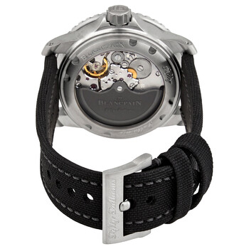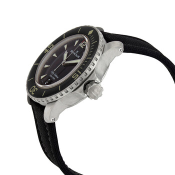 Grey brushed titanium case with a black fabric strap. Uni-directional rotating coin edge grey titanium bezel with a black ceramic (count-up elapsed time) top ring. Black dial with luminous silver-tone hands and index hour markers. Arabic numeral appears at the 12 o'clock position. Minute markers around the outer rim. Dial Type: Analog. Luminescent hands and markers. Date display at the 6 o'clock position. Blancpain Calibre 6918B Automatic movement, containing 44 Jewels, bitting at 28800 vph, and has a power reserve of approximately 120 hours. Scratch resistant sapphire crystal. Screw down crown. Transparent case back. Round case shape, case size: 45 mm, case thickness: 16.27 mm. Band width: 23 mm. Tang clasp. Water resistant at 300 meters / 1000 feet. Functions: big date, hour, minute, second. Additional Info: n05050o12b030nb52a. Fifty Fathoms Series. Dive watch style. Watch label: Swiss Made. Blancpain Fifty Fathoms Grande Date Automatic Black Dial Men's Watch 5050-12B30-B52A.
