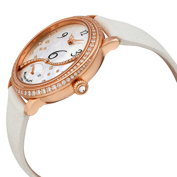18 carat rose gold case with a white ostrich leather strap. Fixed-diamond set bezel. Mother of pearl dial with rose gold-tone hands and Arabic numeral hour markers. Dial Type: Analog. One-retrograde small seconds. Blancpain Calibre 2663SR automatic movement with about 65 hours of power reserve. Scratch resistant sapphire crystal. Pull / push crown. Skeleton transparent exhibition see through case back. Case size: 36.80 mm. Case thickness: 10.30 mm. Round case shape. Band width: 18 mm. Water resistant at 30 meters / 100 feet. Functions: hour, minute, second. Additional Info: 1.24 carat(s). Luxury watch style. Watch label: Swiss Made. Blancpain Heure Decentree Automatic Ladies Watch 3650A-3754-58B.