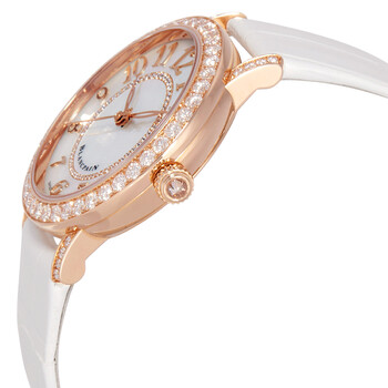 18kt rose gold case with a white leather strap. Fixed diamond set 18kt rose gold bezel. Mother of pearl dial with rose gold-tone hands and Arabic numeral hour markers. Dial Type: Analog. Blancpain Calibre 1153 Automatic movement, based upon Omega 1150, containing 28 Jewels, composed of 186 parts, bitting at 21600 vph, and has a power reserve of approximately 100 hours. Scratch resistant sapphire crystal. Pull / push crown. Transparent see through case back. Round case shape, case size: 34.9 mm. Band width: 18 mm. Buckle clasp. Water resistant at 30 meters / 100 feet. Functions: date, hour, minute, second. Ladybird Series. Luxury watch style. Watch label: Swiss Made. Blancpain Ladybird Automatic Diamond Ladies Watch 3660-2954-W55A.