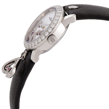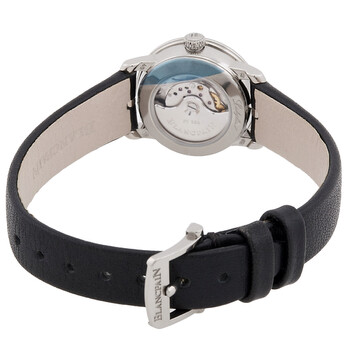18kt white gold case with a black leather strap. Fixed 18kt white gold bezel with diamond set. Mother of pearl dial with silver-tone hands. Dial Type: Analog. Blancpain Calibre 615 Automatic movement, containing 29 Jewels, composed of 180 parts, bitting at 21600 vph, and has a power reserve of approximately 38 hours. Scratch resistant sapphire crystal. Skeleton transparent exhibition see through case back. Round case shape, case size: 21.50 mm. Water resistant at 30 meters / 100 feet. Functions: hour, minute. Additional Info: 0.60 carat(s). Ladybird Ultraplate Series. Luxury watch style. Watch label: Swiss Made. Blancpain Ladybird Ultraplate Automatic Ladies Watch 0063B-1954-63A.