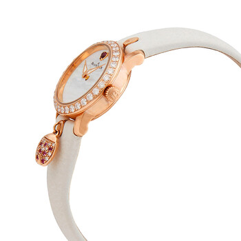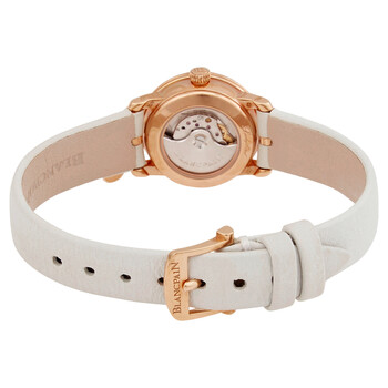 18kt rose gold case with a white varnished leather strap strap. Fixed 18kt rose gold set with diamonds bezel. Mother of pearl with heart-shaped ruby dial with luminous rose gold-tone hands. No markers. Dial Type: Analog. Luminescent hands. Blancpain Calibre 615 Automatic movement, containing 29 Jewels, composed of 180 parts, bitting at 21600 vph, and has a power reserve of approximately 38 hours. Scratch resistant sapphire crystal. Pull / push crown. Transparent case back. Round case shape, case size: 21.5 mm, case thickness: 8.35 mm. Band width: 11 mm. Tang clasp. Water resistant at 30 meters / 100 feet. Functions: hour, minute. Additional Info: 0.57 carat(s). Ladybird Ultraplate Series. Luxury watch style. Watch label: Swiss Made. Item Variations: N00063D029054N063A. Blancpain Ladybird Ultraplate Automatic Ladies Watch 0063D-2954-63A.