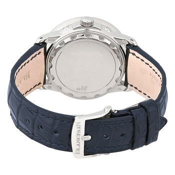 18kt white gold case with a navy blue leather strap. Fixed 18kt white gold bezel with diamond set. Mother of pearl dial with white leaf-style shape hands and Roman-diamond numerals hour markers. Date markers around the outer rim. Dial Type: Analog. Pointer date, day of the week, and month display at the 12 o' clock. One subdial displaying: moonphase/small second. Blancpain Calibre 6763 Automatic movement, containing 30 Jewels, composed of 261 parts, and has a power reserve of approximately 100 hours. Scratch resistant sapphire crystal. Pull / push crown. Solid case back. Round case shape, case size: 34 mm, case thickness: 11.4 mm. Buckle clasp. Water resistant at 30 meters / 100 feet. Functions: full calendar, moon phase, month, date, day, hour, minute, small second. Additional Info: 2.56 cts. Leman Series. Luxury watch style. Watch label: Swiss Made. Blancpain Leman Automatic Ladies Watch 2360-1991A-55B.