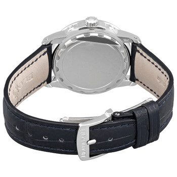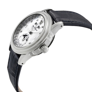 Stainless steel case with a blue leather strap. Fixed stainless steel bezel. White mother of pearl dial with blue leaf-style hands and diamond hour markers. Roman numeals mark the 3, 9 and 12 o'clock positions. Dial Type: Analog. Date scale around the outer rim. Day of the week and month display below the 12 o'clock position. Combination small seconds and moonphase sub-dial. Blancpain calibre 6763 automatic movement, containing 30 Jewels, composed of 261 parts, bitting at 21600 vph, and has a power reserve of approximately 100 hours. Scratch resistant sapphire crystal. Pull / push crown. Solid case back. Round case shape. Case size: 34 mm. Case thickness: 11.4 mm. Deployment clasp. Water resistant at 30 meters / 100 feet. Functions: full calendar, moon phase, month, date, day, hour, minute, small second. Leman Moonphase & Complete Calendar Series. Luxury watch style. Watch label: Swiss Made. Item Variations: 2360 1191A 55B, 2360.1191A.55B, 23601191A55B. Blancpain Leman Automatic White Mother of Pearl Dial Ladies Watch 2360-1191A-55B.
