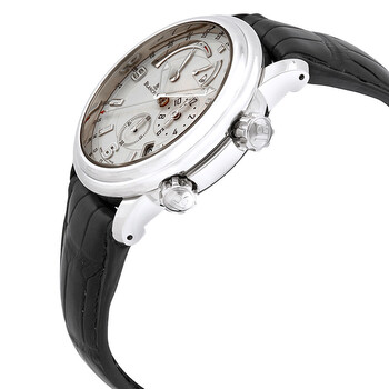 18kt white gold case with a black alligator leather strap. Fixed 18kt white gold bezel. Silver dial with silver-tone skeleton sword-shaped hands and index hour markers. 24 hour scale appears around the outer rim. Dial Type: Analog. Luminescent hands. Date display between 4 and 5 o'clock position. Four sub-dials displaying: 60 second, 12 hour, power reserve indicator and alarm. Blancpain Calibre 1241H Automatic movement, containing 38 Jewels, composed of 407 parts, bitting at 28800 vph, and has a power reserve of approximately 40 hours. Scratch resistant sapphire crystal. Pull / push crown. Transparent case back. Round case shape, case size: 40 mm, case thickness: 13.7 mm. Deployment with push button release clasp. Water resistant at 100 meters / 330 feet. Functions: alarm, date, hour, minute, small second, GMT, second time zone, power reserve indicator. Leman Reveil Gmt Series. Luxury watch style. Watch label: Swiss Made. Item Variations: 2841 1542 53B, 2841.1542.53B, 2841154253B. Blancpain Leman Reveil GMT Silver Dial 18kt White Gold Black Leather Men's Watch 2841-1542-53B.