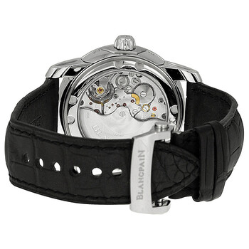 Silver-tone stainless steel case with a black crocodile leather strap. Fixed silver-tone stainless steel bezel. Grey dial with luminous hands and index hour markers. Oversized roman numerals mark the 3 and 9 o'clock positions. minute markers. date scale appears around the outer rim. Dial Type: Analog. Luminescent hands and markers. Full auto calendar. One subdial displaying: small second at the 6 o'clock position. mooonphase display. power reserve display below the 12 o'clock position. Blancpain Calibre 66R9 Automatic movement, containing 36 Jewels, composed of 325 parts, and has a power reserve of approximately 192 hours. Scratch resistant sapphire crystal. Screw down crown. Transparent case back. Round case shape, case size: 43.5 mm, case thickness: 15.5 mm. Deployment with push button release clasp. Water resistant at 100 meters / 330 feet. Functions: full calendar, moon phase, month, date, day, hour, minute, small second, power reserve indicator. L-evolution Moonphase 8 Days Series. Luxury watch style. Watch label: Swiss Made. Item Variations: 8866113453b. Blancpain L-Evolution Moonphase Automatic 8 Days Men's Watch 8866-1134-53B.