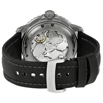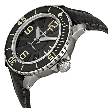 Grey brushed titanium case with a black sailcloth band. Uni-directional rotating coin edge titanium bezel with a black count-up elapsed time top ring. Black dial with luminous hands and Arabic numeral mark the 3, 6, 9 and 12 o'clock positions hour markers. Minute markers around the outer rim. Dial Type: Analog. Luminescent hands and markers. Date display between 4 and 5 o'clock position. Blancpain Calibre 1315 Automatic movement, containing 35 Jewels, composed of 227 parts, and has a power reserve of approximately 120 hours. Scratch resistant sapphire crystal. Screw down crown. Skeleton case back. Round case shape, case size: 48 mm, case thickness: 16.95 mm. Deployment with push button release clasp. Water resistant at 1000 meters / 3300 feet. Functions: date, hour, minute, second. Additional Info: decompression valve. Sport 500 Fathoms Series. Luxury watch style. Watch label: Swiss Made. Item Variations: 50015 12B30 52, 50015.12B30.52, 5001512B3052. Blancpain Sport 500 Fathoms Black Dial Titanium Automatic Men's Watch 50015-12B30-52.