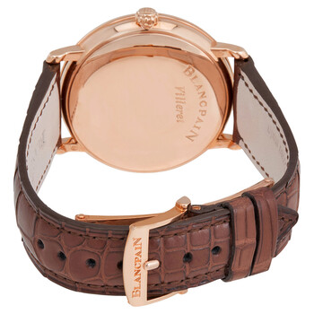 18kt rose gold case with a brown alligator leather strap. Fixed 18kt rose gold bezel with diamond set. Opaline dial with rose gold-tone leaf-style shape hands and diamonds hour markers. Dial Type: Analog. Date display at the 3 o'clock position. Blancpain Calibre 1150 Automatic movement, containing 28 Jewels, composed of 210 parts, bitting at 21600 vph, and has a power reserve of approximately 100 hours. Scratch resistant sapphire crystal. Pull / push crown. Solid case back. Round case shape, case size: 37.60 mm, case thickness: 9.15 mm. Band width: 20 mm. Pin buckle clasp. Water resistant at 30 meters / 100 feet. Functions: date, hour, minute, second. Ultraplate Series. Luxury watch style. Watch label: Swiss Made. Blancpain Ultraplate Automatic Men's Watch 6223-2987-55B.