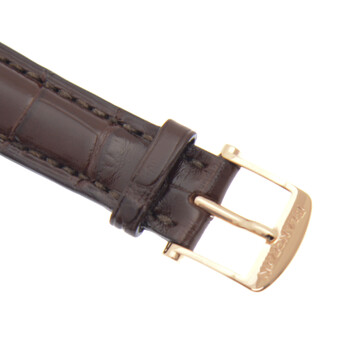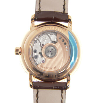 18kt rose gold case with a brown leather strap. Fixed 18kt rose gold bezel set with diamonds. White dial with gold-tone leaf-style hands and diamond hour markers. Roman numerals mark the 3, 6, 9 and 12 o'clock positions. Dial Type: Analog. Blancpain calibre 913 automatic movement, containing 20 Jewels, composed of 174 parts, bitting at 21600 vph, and has a power reserve of approximately 40 hours. Scratch resistant sapphire crystal. Screw down crown. Transparent case back. Round case shape. Case size: 29 mm. Case thickness: 9 mm. Band width: 15 mm. Tang clasp. Water resistant at 30 meters / 100 feet. Functions: hour, minute, second. Luxury watch style. Watch label: Swiss Made. Blancpain Villeret Automatic Diamond White Dial Ladies Watch 6104-2987-55A.
