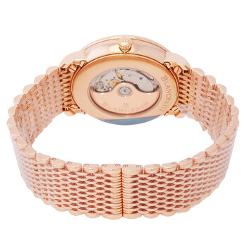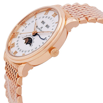 18kt rose gold case with a rose gold-tone 18kt rose gold bracelet. Fixed 18kt rose gold bezel. Opaline dial with rose gold-tone hands and Roman numeral hour markers. Dial Type: Analog. Pointer date. One subdial displaying: moonphase. Blancpain Calibre 6654 Automatic movement, containing 28 Jewels, composed of 321 parts, bitting at 28800 vph, and has a power reserve of approximately 72 hours. Scratch resistant sapphire crystal. Pull / push crown. Round case shape, case size: 40 mm, case thickness: 10.65 mm. Band width: 22 mm. Water resistant at 30 meters / 100 feet. Functions: full calendar, moon phase, month, date, day, hour, minute, second. Villeret Series. Luxury watch style. Watch label: Swiss Made. Blancpain Villeret Automatic Men's Watch 6654-3642-MMB.