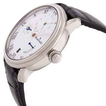 18kt white gold case with a black alligator leather strap. Fixed 18kt white gold bezel. White dial with silver-tone hands and Roman numeral hour markers. Dial Type: Analog. Date display at the 6 o'clock position. Three sub-dials displaying: 12 hour / 60 ninute, day/night indicator and power reserve indicator. Blancpain Calibre 5235DF Automatic movement, containing 36 Jewels, composed of 324 parts, and has a power reserve of approximately 192 hours. Scratch resistant sapphire crystal. Skeleton transparent exhibition see through case back. Round case shape, case size: 42 mm, case thickness: 13.65 mm. Band width: 23 mm. Water resistant at 30 meters / 100 feet. Functions: date, hour, minute, second, power reserve, and day and night indication. Villeret Series. Luxury watch style. Watch label: Swiss Made. Blancpain Villeret Automatic Men's Watch 6661-1531-55B.