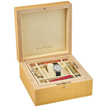 Stainless steel case with a black fabric strap. Fixed stainless steel bezel. Silver dial with silver-tone hands and Roman numeral hour markers. Dial Type: Analog. Blancpain calibre 913 automatic movement, containing 20 Jewels, composed of 174 parts, bitting at 21600 vph, and has a power reserve of approximately 40 hours. Scratch resistant sapphire crystal. Pull / push crown. Transparent case back. Round case shape. Case size: 29.2 mm. Case thickness: 9.2 mm. Band width: 15 mm. Tang clasp. Water resistant at 30 meters / 100 feet. Functions: hour, minute, second. Additional Info: with 4 additional straps for a total of 4 alligator straps & 1 satin strap. Villeret Series. Luxury watch style. Watch label: Swiss Made. Blancpain Villeret Automatic Silver Dial Ladies Watch 6104 1127 95A.