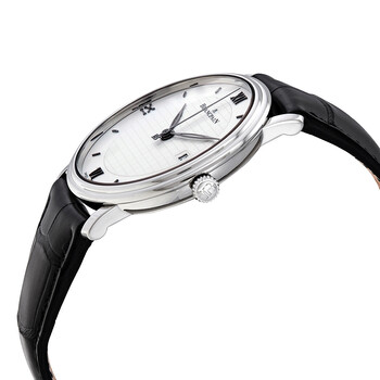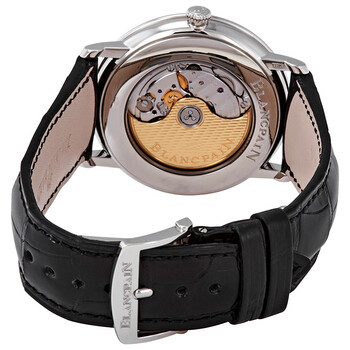 Stainless steel case with a black (alligator) leather strap. Fixed stainless steel bezel. Silver dial with black hands and index hour markers. Roman numerals mark the 3, 6, 9 and 12 o'clock positions. Dial Type: Analog. Date display at the 3 o'clock position. Blancpain calibre 1151 automatic movement, containing 28 Jewels, composed of 210 parts, bitting at 21600 vph, and has a power reserve of approximately 100 hours. Scratch resistant sapphire crystal. Pull / push crown. Transparent case back. Round case shape. Case size: 40 mm. Case thickness: 8.7 mm. Band width: 20 mm. Deployment buckle clasp. Water resistant at 30 meters / 100 feet. Functions: date, hour, minute, second. Villeret Series. Luxury watch style. Watch label: Swiss Made. Item Variations: 6651 1143 55B, 6651.1143.55B, 6651114355B. Blancpain Villeret Automatic Silver Dial Men's Watch 6651-1143-55B.
