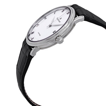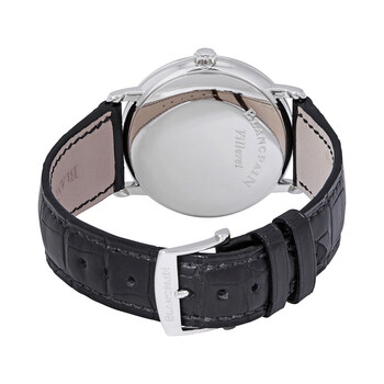 Stainless steel case with a black (alligator) leather strap. Fixed stainless steel bezel. White dial with silver-tone leaf-style hands and Roman numeral hour markers. Dial Type: Analog. Date display at the 3 o'clock position. Blancpain calibre 1150 automatic movement, containing 28 Jewels, composed of 210 parts, bitting at 21600 vph, and has a power reserve of approximately 100 hours. Scratch resistant sapphire crystal. Solid case back. Round case shape. Case size: 38 mm. Case thickness: 9.15 mm. Band width: 20.00 mm. Tang clasp. Water resistant at 30 meters / 100 feet. Functions: date, hour, minute, second. Villeret Series. Luxury watch style. Watch label: Swiss Made. Blancpain Villeret Automatic White Dial Men's Watch 6223-1127-55A.