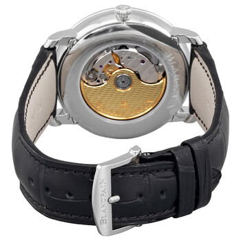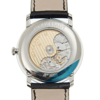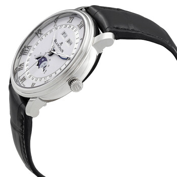 Stainless steel case with a black crocodile leather strap. Fixed stainless steel bezel. White dial with Roman numeral hour markers. Dial Type: Analog. Date display at the center of the dial. One subdial displaying: moonphase. Blancpain Calibre 6654 Automatic movement, containing 28 Jewels, composed of 321 parts, bitting at 28800 vph, and has a power reserve of approximately 72 hours. Scratch resistant sapphire crystal. Pull / push crown. Skeleton transparent exhibition see through case back. Round case shape, case size: 40 mm, case thickness: 10.74 mm. Band width: 22 mm. Fold over with safety release clasp. Water resistant at 30 meters / 100 feet. Functions: full calendar, moon phase, month, date, day, hour, minute, second. Additional Info: 28 jewels. Villeret Series. Luxury watch style. Watch label: Swiss Made. Blancpain Villeret Automatic White Dial Men's Watch 6654A-1127-55B.