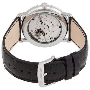 Silver-tone stainless steel case with a black alligator band. Fixed silver-tone stainless steel bezel. White dial with silver-tone hands and Roman numeral hour markers. Dial Type: Analog. Blancpain Calibre 11C5.4 hand wind movement with a 72-hour power reserve. Scratch resistant sapphire crystal. Transparent case back. Round case shape, case size: 40 mm. Fold over clasp. Water resistant at 30 meters / 100 feet. Functions: hour, minute,power reserve indication. Additional Info: original box, manual (complete accessories). Villeret Series. Luxury watch style. Watch label: Swiss Made. Item Variations: N06605O011027N055B. Blancpain Villeret Hand Wind White Dial Men's Watch 6605-1127-55B.