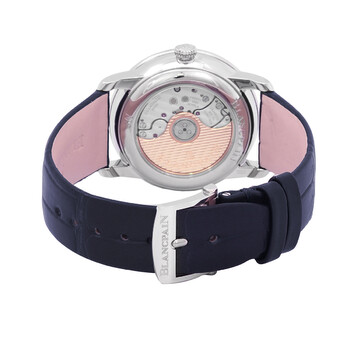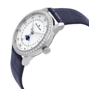 Silver-tone stainless steel case with a alligator band. Fixed silver-tone bezel with diamond set. White dial with silver-tone hands and diamond-Roman numerals hour markers. Dial Type: Analog. Pointer date. One subdial displaying: moonphase. Blancpain Calibre 913QL.P Automatic movement, containing 29 Jewels, bitting at 21600 vph, and has a power reserve of approximately 40 hours. Scratch resistant sapphire crystal. Pull / push crown. Transparent case back. Round case shape, case size: 33.2 mm, case thickness: 10.2 mm. Band width: 18 mm. Tang clasp. Water resistant at 30 meters / 100 feet. Functions: moon phase, date, hour, minute, second. Additional Info: original box, international warranty card, manual (complete accessories). Villeret Moonphase Series. Luxury watch style. Watch label: Swiss Made. Blancpain Villeret Moonphase Diamond White Dial Unisex Watch 6126-4628-55B.