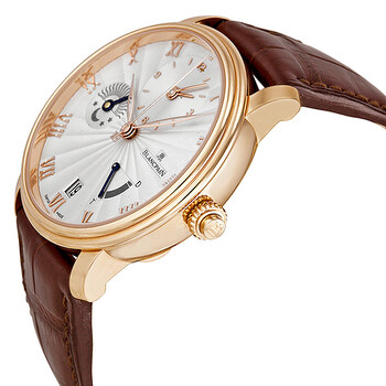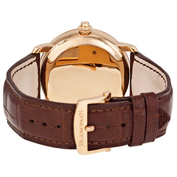 18kt rose gold case with a brown (alligator) leather strap. Fixed 18kt rose gold bezel. Stamped flinque opaline dial with gold-toned skeleton leaf-style shape hands and Roman numeral hour markers. Dial Type: Analog. Date display at the 6 o'clock position. Two displays showing: second time zone 12 hour/60 minute, day/night indicator, Power reserve indicator. Blancpain calibre 5254DF automatic movement, containing 28 Jewels, composed of 321 parts, bitting at 28800 vph, and has a power reserve of approximately 72 hours. Scratch resistant sapphire crystal. Pull / push crown. Transparent case back. Round case shape. Case size: 40 mm. Case thickness: 10.65 mm. Band width: 20 mm. Tang clasp. Water resistant at 30 meters / 100 feet. Functions: date, GMT, second time zone, hour, minute, second, power reserve indicator, day/night indicator. Villeret Series. Luxury watch style. Watch label: Swiss Made. Item Variations: 6665 3642 55B, 6665.3642.55B, 6665364255B. Blancpain Villeret Opaline Dial 18kt Rose Gold Brown Leather Men's Watch 6665-3642-55B.