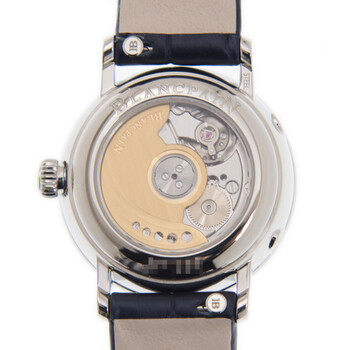 Silver-tone polished stainless steel case with a blue (alligator) leather strap. Fixed silver-tone bezel with diamond set. White dial with silver-tone leaf-style shape hands and diamond and Roman numeral hour markers. Date scale around an inner ring. Dial Type: Analog. Pointer date. One subdial displaying: moonphase. Blancpain Calibre 913QL Automatic movement, containing 20 Jewels, composed of 246 parts, bitting at 21600 vph, and has a power reserve of approximately 40 hours. Scratch resistant sapphire crystal. Pull / push crown. Transparent case back. Round case shape, case size: 29.2 mm, case thickness: 10.36 mm. Band width: 15 mm. Tang clasp. Water resistant at 30 meters / 100 feet. Functions: date, hour, minute, second, moonphase. Villeret Quantieme Phases De Lune Series. Luxury watch style. Watch label: Swiss Made. Blancpain Villeret Quantieme Phases de Lune Automatic Diamond Ladies Watch 6106-4628-55A.