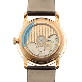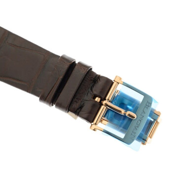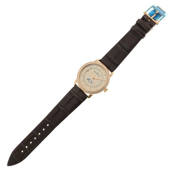 18kt rose gold case with a brown leather strap. Fixed 18kt rose gold bezel. Silver dial with rose gold hands and Roman- diamonds numeral hour markers. Dial Type: Analog. Pointer date. Blancpain Calibre 913QL.P Automatic movement, containing 29 Jewels, bitting at 21600 vph, and has a power reserve of approximately 40 hours. Scratch resistant sapphire crystal. Pull / push crown. Transparent case back. Round case shape, case size: 33.2 mm, case thickness: 10.20mm. Deployant clasp. Water resistant at 30 meters / 100 feet. Functions: date, hour, minute, second. Villeret Quantieme Phases De Lune Series. Luxury watch style. Watch label: Swiss Made. Blancpain Villeret Quantieme Phases de Lune Automatic Diamond Silver Dial Ladies Watch 6126-2987-55B.