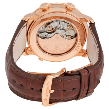 18kt rose gold case with a brown alligator leather strap. Fixed 18kt rose gold bezel. Stamped flinque opaline dial with gold-tone leaf-style shape hands and Roman numeral hour markers. Dial Type: Analog. Date display at the 6 o'clock position. Two sub-dials displaying: 12 hours and power reserve indicator. Blancpain Calibre 1240H Automatic movement, containing 36 Jewels, composed of 392 parts, and has a power reserve of approximately 45 hours. Scratch resistant sapphire crystal. Pull / push crown. Skeleton transparent exhibition see through case back. Round case shape, case size: 40.30 mm, case thickness: 12.1 mm. Fold over clasp. Water resistant at 30 meters / 100 feet. Functions: alarm, date, hour, minute, second, GMT, second time zone, power reserve indicator. Villeret Reveil Gmt Series. Luxury watch style. Watch label: Swiss Made. Item Variations: 6640 3642 55B, 6640.3642.55B, 6640364255B. Blancpain Villeret Reveil 18kt Rose Gold GMT Alarm Stamped Flinque Opaline Dial Men's Watch 6640-3642-55B.