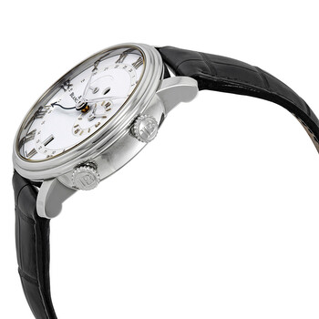 Silver-tone stainless steel case with a black alligator leather strap. Fixed silver-tone stainless steel bezel. White dial with silver-tone leaf-style shape hands and Roman numeral hour markers. Gmt scale around the inner ring. Dial Type: Analog. Date display at the 6 o'clock position. Two sub-dials displaying: dual timezone and power reserve indicator. Blancpain Calibre 1240H Automatic movement, containing 36 Jewels, composed of 392 parts, and has a power reserve of approximately 45 hours. Scratch resistant sapphire crystal. Transparent see through case back. Round case shape, case size: 40.30 mm. Pin buckle clasp. Water resistant at 30 meters / 100 feet. Functions: alarm, date, hour, minute, second, GMT, second time zone, power reserve indicator. Reveil Gmt Series. Luxury watch style. Watch label: Swiss Made. Item Variations: 6640 1127 55B, 6640.1127.55B, 6640112755B. Blancpain Villeret Reveil GMT Alarm Automatic Men's Watch 6640-1127-55B.