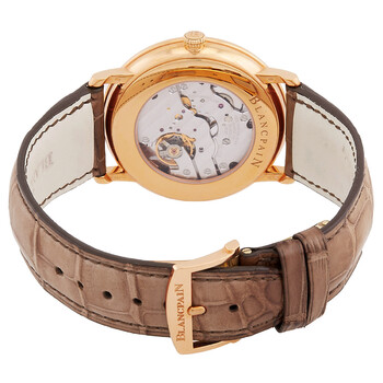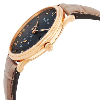 18kt rose gold case with a brown crocodile leather strap. Fixed 18kt rose gold bezel. Stamped flinque black dial with rose gold-tone hands and Roman numeral hour markers. Dial Type: Analog. Date display at the 3 o'clock position. Two sub-dials displaying: smal second and power reserve indicator. Blancpain Calibre 11C5 Hand Wind movement, containing 28 Jewels, composed of 216 parts, bitting at 21600 vph, and has a power reserve of approximately 100 hours. Scratch resistant sapphire crystal. Pull / push crown. Skeleton transparent exhibition see through case back. Round case shape, case size: 40 mm, case thickness: 8.55 mm. Deployment clasp. Water resistant at 30 meters / 100 feet. Functions: date, hour, minute, small second, power reserve indicator. Villeret Series. Luxury watch style. Watch label: Swiss Made. Item Variations: 6606 3630 55B, 6606.3630.55B, 6606363055B. Blancpain Villeret Stamped Flinque Black Dial Automatic 18 Carat Rose Gold Watch 6606-3630-55B.