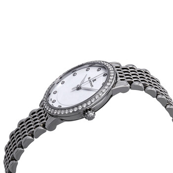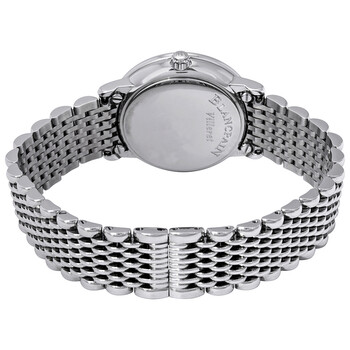 Silver-tone stainless steel case with a silver-tone stainless steel mesh bracelet. Fixed silver-tone bezel with diamond set. White dial with silver-tone leaf-style shape hands and diamond hour markers. Dial Type: Analog. Blancpain Calibre 953 Automatic movement, containing 21 Jewels, composed of 175 parts, bitting at 21600 vph, and has a power reserve of approximately 40 hours. Scratch resistant sapphire crystal. Solid case back. Round case shape, case size: 29 mm, case thickness: 8.7 mm. Band width: 15 mm. Folding clasp. Water resistant at 30 meters / 100 feet. Functions: hour, minute, second. Additional Info: 0.75 carat(s). Villeret Series. Luxury watch style. Watch label: Swiss Made. Blancpain Villeret Ultra Slim Automatic Diamond Ladies Watch 6102-4628-AMMB.