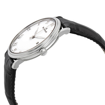 Stainless steel case with a black (alligator) leather strap. Fixed stainless steel bezel. White dial with silver-tone leaf-style hands and Roman numeral hour markers. Dial Type: Analog. Date display at the 3 o'clock position. Blancpain calibre 1151 automatic movement, containing 28 Jewels, composed of 210 parts, bitting at 21600 vph, and has a power reserve of approximately 100 hours. Scratch resistant sapphire crystal. Pull / push crown. Transparent case back. Round case shape. Case size: 40 mm. Case thickness: 8.6 mm. Band width: 20.3 mm. Deployment clasp. Water resistant at 30 meters / 100 feet. Functions: date, hour, minute, second. Villeret Series. Luxury watch style. Watch label: Swiss Made. Item Variations: 6651 1127 55B, 6651.1127.55B, 6651112755B. Blancpain Villeret Ultra Slim Automatic White Dial Men's Watch 6651-1127-55B.