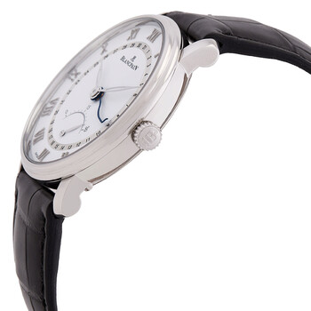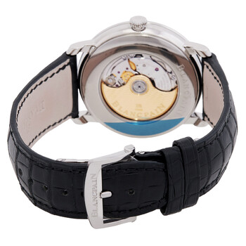 Silver-tone stainless steel case with a black alligator leather strap. Fixed silver-tone stainless steel bezel. White dial with white hands and Roman numeral hour markers. Dial Type: Analog. Luminescent hands. Pointer date. One- retrograde small seconds subdials. Blancpain Calibre 7663Q automatic movement with a 65-hour power reserve. Scratch resistant sapphire crystal. Pull / push crown. Transparent case back. Round case shape, case size: 40 mm, case thickness: 10.88 mm. Band width: 22 mm. Deployant buckle clasp. Water resistant at 30 meters / 100 feet. Functions: date, hour, minute, second, retrograde small seconds. Luxury watch style. Watch label: Swiss Made. Blancpain Villeret Ultra Slim Automatic White Dial Retrograde Men's Watch 6653Q-1127-55B.