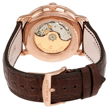 18kt rose gold case with a brown alligator leather strap. Fixed 18kt rose gold bezel. Silver dial with rose gold-tone hands and Roman numeral hour markers. Calendar scale appears around the outer rim. Dial Type: Analog. Date. One subdial displaying: retrograde small second. Blancpain Calibre 7663Q Automatic movement, containing 34 Jewels, composed of 244 parts, bitting at 28800 vph, and has a power reserve of approximately 65 hours. Scratch resistant sapphire crystal. Pull / push crown. Transparent case back. Round case shape, case size: 40 mm, case thickness: 10.83 mm. Deployment clasp. Water resistant at 30 meters / 100 feet. Functions: date, hour, minute, second. Villeret Series. Luxury watch style. Watch label: Swiss Made. Item Variations: 6653Q 3642 55B, 6653Q.3642.55B, 6653Q364255B. Blancpain Villeret Ultra Slim Silver Dial 18K Rose Gold Men's Watch 6653Q-3642-55B.