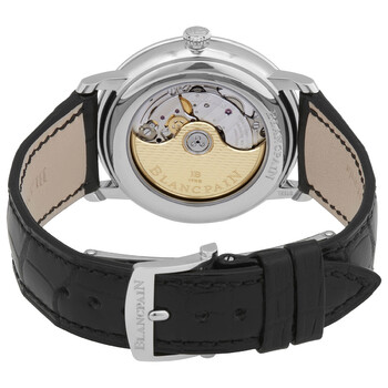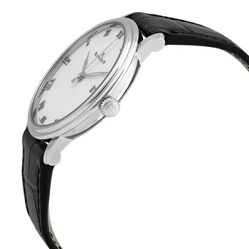 Stainless steel case with a black (alligator) leather strap. Fixed stainless steel bezel. White dial with luminous silver-tone hands and Roman numeral hour markers. Dial Type: Analog. Luminescent hands. Date display at the 3 o'clock position. Blancpain caliber 1150 automatic movement. Scratch resistant sapphire crystal. Transparent case back. Round case shape. Case size: 38 mm. Case thickness: 8.35 mm. Deployment clasp. Water resistant at 30 meters / 100 feet. Functions: date, hour, minute, second. Villeret Ultraplate Series. Luxury watch style. Watch label: Swiss Made. Blancpain Villeret Ultraplate Automatic White Dial Men's Watch 6224 1127 55B.