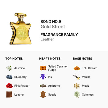 Gold Street opens with a captivating burst of jasmine, juicy blueberry, and a dash of pink pepper, all wrapped in smooth leather. This intriguing combination creates a fresh yet edgy introduction that immediately sparks curiosity. As the scent unfolds, a heart of salted caramel fudge, iris, ambrette, and suede adds a sweet and creamy richness with a soft, velvety texture. It's both comforting and sophisticated, striking the perfect balance between bold and inviting.