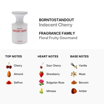With its tantalizing blend of notes and stylish presentation, Indecent Cherry by Borntostandout is more than just a fragrance—it's an experience. Available for shipment within the Contiguous United States and Canada, this exclusive scent is just a click away from becoming part of your collection.