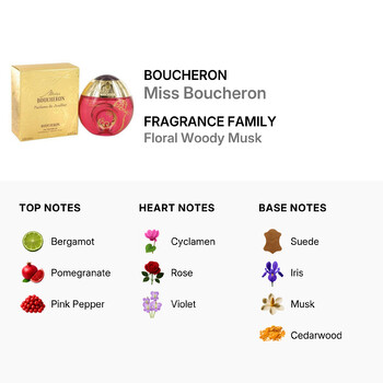 Belonging to the Floral Woody Musk fragrance family, Miss Boucheron opens with a burst of freshness thanks to its radiant top notes of bergamot, juicy pomegranate, and a hint of pink pepper. These vibrant scents create an exciting first impression that’s both feminine and bold. At its heart, soft floral notes of cyclamen, rose, and violet bloom beautifully, adding a romantic and graceful touch to the fragrance.
