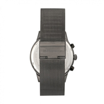 Gunmetal alloy case with a gunmetal alloy mesh bracelet. Fixed gunmetal alloy bezel. Black dial with silver-tone hands and index hour markers. Minute markers around the outer rim. Dial Type: Analog. Luminescent hands. Date display between 4 and 5 o'clock position. Chronograph - three sub-dials displaying: 60 second, 60 minute and 1/10th of a second. Quartz movement. Scratch resistant mineral crystal. Pull / push crown. Solid case back. Round case shape, case size: 42 mm, case thickness: 11 mm. Band width: 22 mm. Box with tongue and safety clasp. Water resistant at 50 meters / 165 feet. Functions: chronograph, date, hour, minute, second. Sport watch style. Watch label: Japan Movt. Item Variations: BRD7605. Breed Espinosa Chronograph Black Dial Men's Watch 7605.