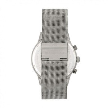 Silver-tone alloy case with a silver-tone alloy mesh bracelet. Fixed silver-tone alloy bezel. Silver-tone dial with silver-tone hands and index hour markers. Minute markers around the outer rim. Dial Type: Analog. Luminescent hands. Date display between 4 and 5 o'clock position. Chronograph - three sub-dials displaying: 60 second, 60 minute and 1/10th of a second. Quartz movement. Scratch resistant mineral crystal. Pull / push crown. Solid case back. Round case shape. Case size: 42 mm. Case thickness: 11 mm. Band width: 22 mm. Fold over slip through clasp. Water resistant at 50 meters / 165 feet. Functions: chronograph, date, hour, minute, second. Sport watch style. Watch label: Japan Movt. Item Variations: BRD7601. Breed Espinosa Chronograph Silver Dial Men's Watch 7601.