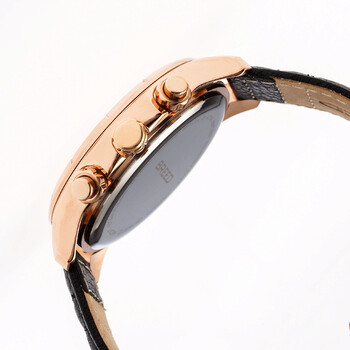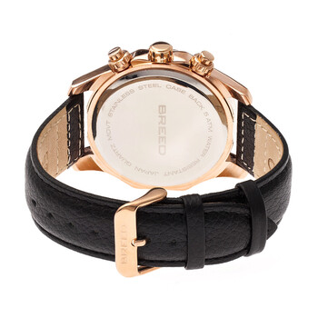Rose gold-tone stainless steel case with a black leather strap. Fixed rose gold-tone bezel. Blue dial with luminous rose gold-tone hands and index hour markers. Minute markers around the outer rim. Dial Type: Analog. Luminescent hands and markers. Chronograph - three sub-dials displaying: 60 second, 30 minute and 24 hour. Quartz movement. Scratch resistant mineral crystal. Pull / push crown. Solid case back. Round case shape. Case size: 47 mm. Case thickness: 12 mm. Band width: 22 mm. Tang clasp. Water resistant at 50 meters / 165 feet. Functions: chronograph, GMT, second time zone, hour, minute, second. Lacroix Series. Sport watch style. Watch label: Japan Movt. Item Variations: BRD6803. Breed Lacroix Chronograph Blue Dial Watch 6803.