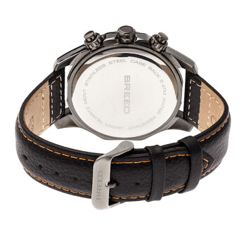 Gunmetal stainless steel case with a black genuine leather strap. Fixed gunmetal stainless steel bezel. Charcoal dial with silver-tone hands and index hour markers. Minute markers around the outer rim. Dial Type: Analog. Luminescent hands and markers. Quartz movement. Scratch resistant mineral crystal. Pull / push crown. Solid case back. Round case shape, case size: 47 mm, case thickness: 12 mm. Band width: 22 mm. Buckle clasp. Water resistant at 50 meters / 165 feet. Functions: chronograph, GMT, second time zone, hour, minute, second. Sport watch style. Watch label: Japan Movt. Item Variations: BRD6805. Breed Lacroix Chronograph Watch 6805.