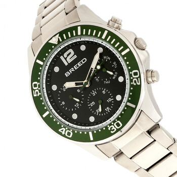 Silver-tone alloy case with a silver-tone alloy bracelet. Green alloy bezel. Black dial with silver-tone hands and Arabic numeral and index hour markers. Minute markers around the outer rim. Dial Type: Analog. Luminescent hands and markers. Date display at the 6 o'clock position. Three - date, day, 24 hour subdials. Quartz movement. Scratch resistant mineral crystal. Pull / push crown. Solid case back. Round case shape, case size: 46 mm, case thickness: 11 mm. Band width: 22 mm. Fold over push button deployment clasp. Water resistant at 50 meters / 165 feet. Functions: date, day, GMT, second time zone, hour, minute, second. Casual watch style. Watch label: Japan Movt. Item Variations: BRD8102. Breed Pegasus Black Dial Men's Watch 8102.