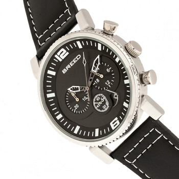 Silver-tone alloy case with a black genuine leather strap. Fixed silver-tone alloy bezel. Black dial with gunmetal hands and Arabic numeral and index hour markers. Minute markers around the outer rim. Dial Type: Analog. Date display between 4 and 5 o'clock position. Quartz movement. Scratch resistant mineral crystal. Pull / push crown. Solid case back. Round case shape, case size: 45 mm, case thickness: 12 mm. Band width: 24 mm. Buckle clasp. Water resistant at 50 meters / 165 feet. Functions: chronograph, date, hour, minute, second. Sport watch style. Watch label: Japan Movt. Item Variations: BRD8202. Breed Ryker Chronograph Black Dial Men's Watch 8202.