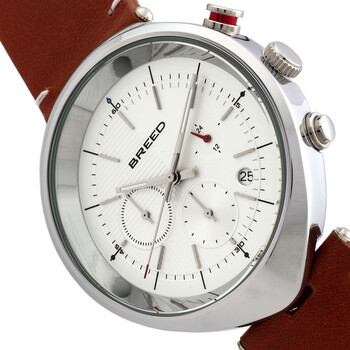 Silver-tone alloy case with a brown leather strap. Fixed silver-tone alloy bezel. White dial with luminous silver-tone stick-shaped hands and index hour markers. Minute markers. Dial Type: Analog. Luminescent hands. Date display between 4 and 5 o'clock position. Chronograph - three sub-dials displaying: 60 small second, 60 minute & 24 hour. Quartz movement. Scratch resistant mineral crystal. Pull / push crown. Solid case back. Round case shape. Case size: 43 mm. Case thickness: 11 mm. Band width: 22 mm. Band length: 9.29 inches. Tang clasp. Water resistant at 50 meters / 165 feet. Functions: chronograph, date, hour, minute, second, 24 hour. Tempest Series. Casual watch style. Watch label: Japan Movt. Breed Tempest Chronograph Quartz White Dial Men's Watch BRD8601.